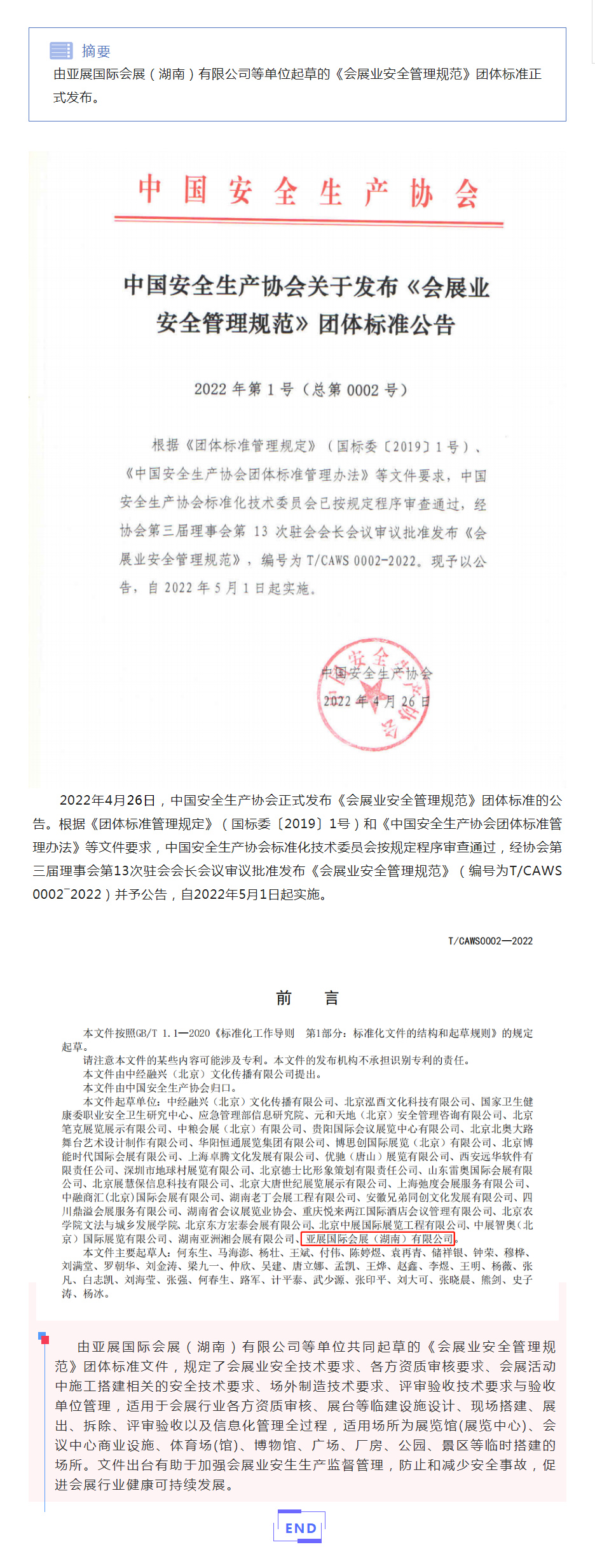 中国安全生产协会发布《会展业安全管理规范》团体标准,亚展国际会展(湖南)有限公司等单位参与起草